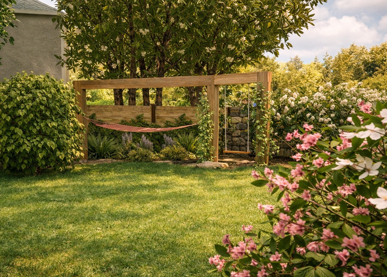 Horní část zahrady přechází do pobytové zóny s houpací sítí, zasazené do zeleně. Výsadba je vrstevnatá – kombinuje trvalky, okrasné trávy, keře a menší stromy. Zajišťuje celoroční proměnlivost a přirozený vzhled bez potřeby náročné formální údržby.