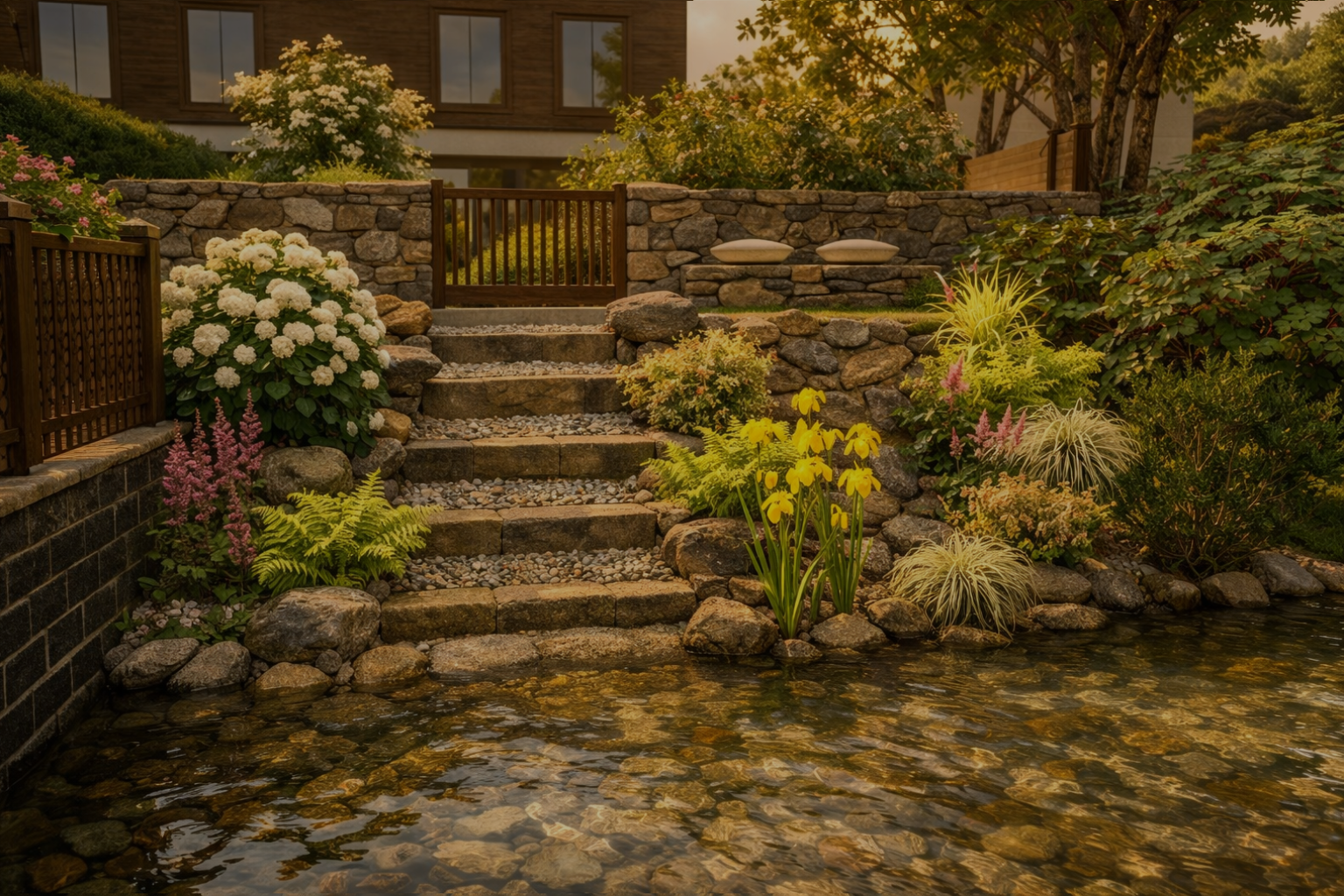 Potok s kamennými stupni a opěrnou zídkou tvoří přirozenou hranici zahrady. Voda odráží světlo, přináší pohyb a dodává prostoru hloubku. Schodiště a zídka z přírodního kamene plynule propojují jednotlivé výškové úrovně a umožňují přirozený pohyb zahradou.